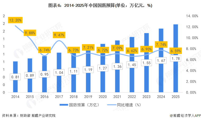 近年来,为维护国家主权、安全、发展利益,中国在推动经济社会持续健康发展的同时,总体保持国防支出合理稳定增长,促进国防实力和经济实力同步提升。根据财政部数据显示,2014-2024年,我国国防预算稳步攀升,从2014年的0.81万亿元增长至2024年的1.67万亿元,2024年同比增长率为7.74%。军费增加通常意味着军队有更多资源用于开展各类军事行动和训练。海军舰船在执行巡逻、护航、演习等任务以及日常训练的频次和时长都会增加。声呐设备在这些行动中持续运行,工作时间延长、使用强度增大,导致其各部件磨损加剧,更容易出现故障和性能下降,从而预计需要更频繁地进行维护和“耗材”替换。